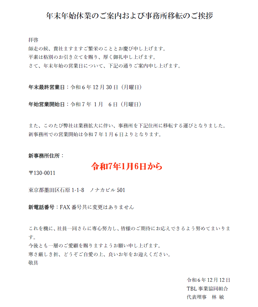 さて、このたび弊社は業務拡大に伴い、下記の住所に移転する運びとなりましたのでご案内申し上げます。 新住所での業務開始日は以下の通りです。